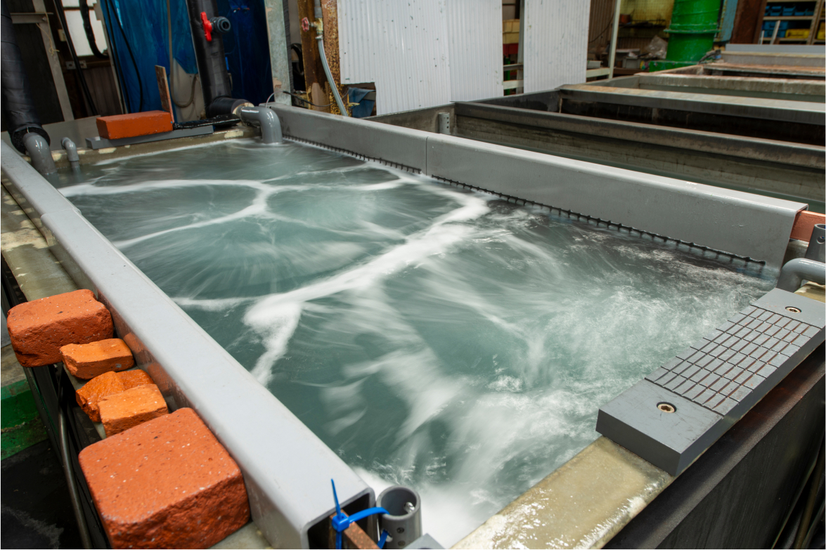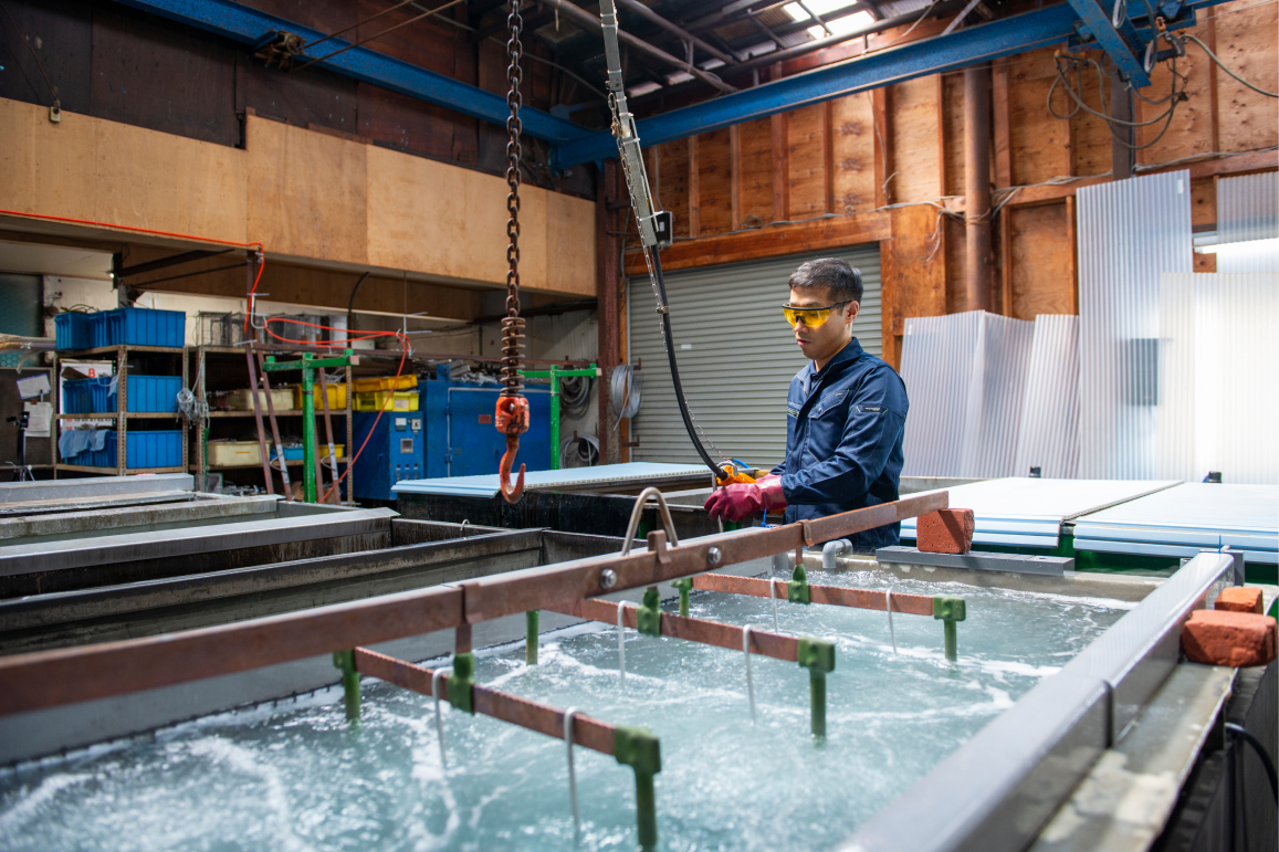 W900×H900×L1800の電解槽を使用し、大型の品物の加工に対応可能です。小ロットや急ぎのご依頼にも柔軟に対応いたします。